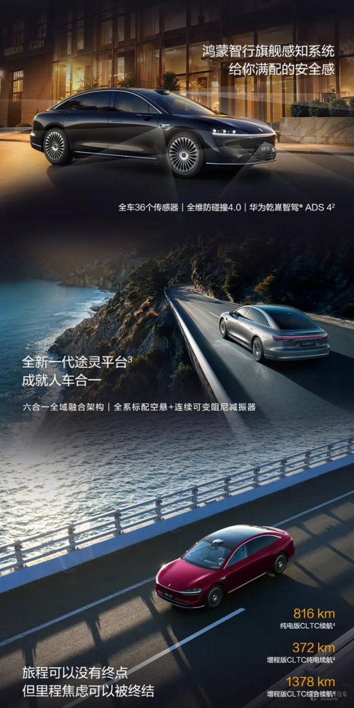 尾部配备点阵式灯珠的星云贯穿式尾灯,同时尾灯和两侧外后视镜增加智驾小蓝灯。另外新车在智能辅助驾驶方面,新车将搭载36个高精度传感器,搭载华为乾崑智驾ADS 4,标配四激光雷达,前向升级3分布式毫米波雷达矩阵,并新增车外麦克风。