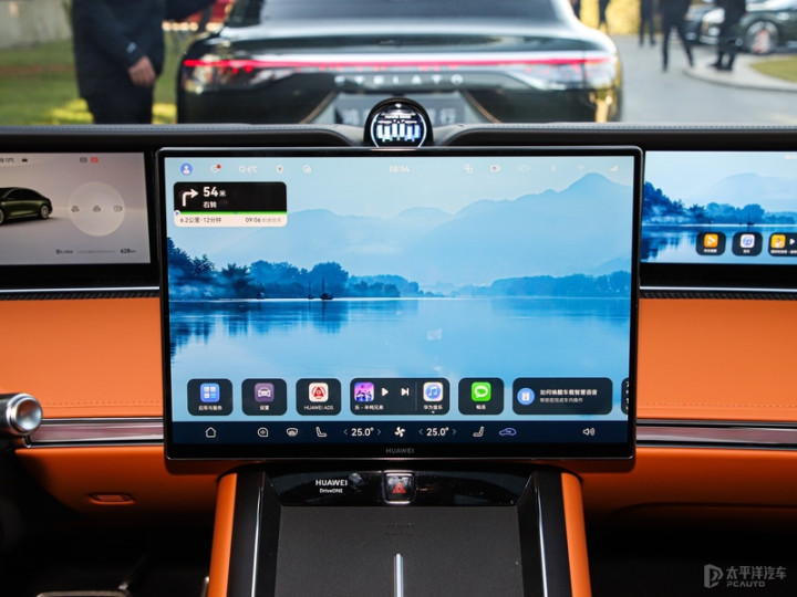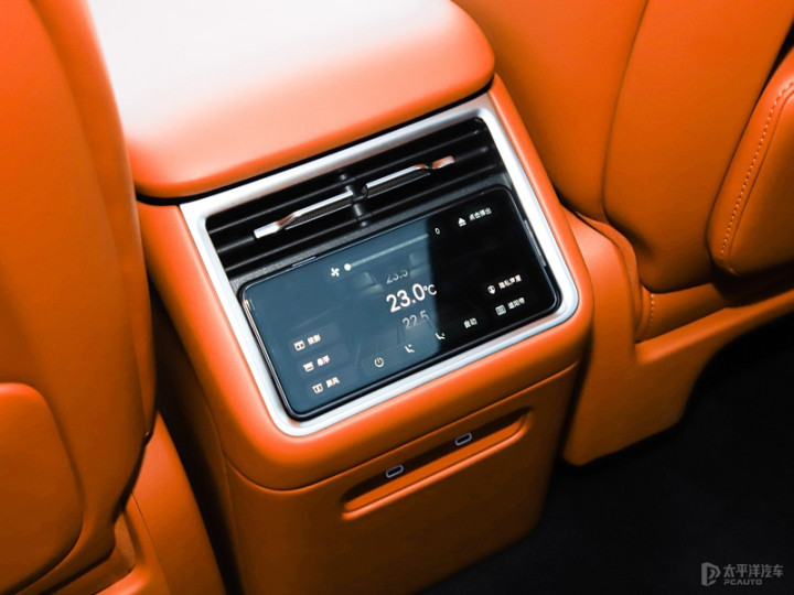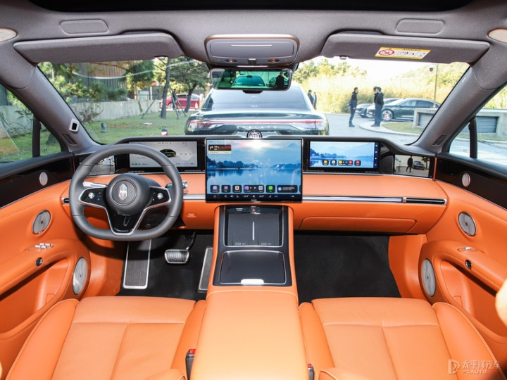 座舱是环抱式设计,新增赤茶橘配色。用料都是 Nappa 真皮包裹,搭配全天然实木材质。前方分别配备12.3英寸的全液晶仪表盘和全新的副驾娱乐屏。全新的16.1的中控屏和两侧电子外后视镜显示屏。